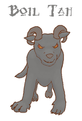 Boil Tah is probably male. His mutations are ram horns on his head (curving back and around behind his ears) and a hoof on his left hindleg instead of a paw.